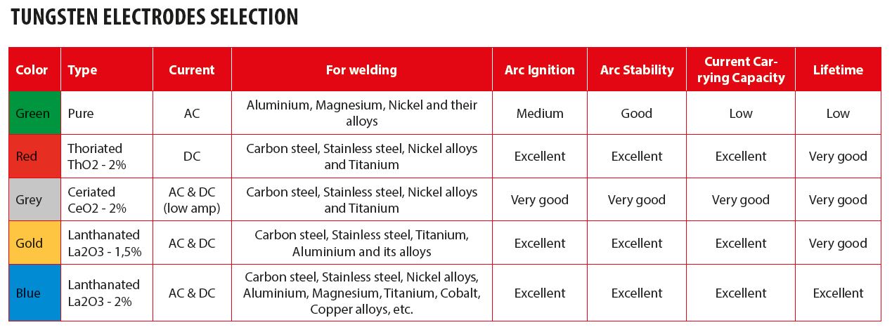 Excellent for DC welding (both negative or positive polarity) on carbon steel, stainless steel, nickel and titanium. The most preferred electrode today for its long lifetime and ease of use. The Thorium improves arc ignition and allows for a higher current-carrying capacity. This electrode operates far below its melting temperature, which results in a significantly lower consumption and a greater arc stability. During welding, the Thorium is uniformly dispersed throughout the electrode, which helps the tungsten to maintain its sharpened edge. The Thoriated electrodes deposit less tungsten into the weld puddle than other types, reducing the weld contamination. Rarely used for special AC welding (very thin aluminium or materials less than 1,5 mm).