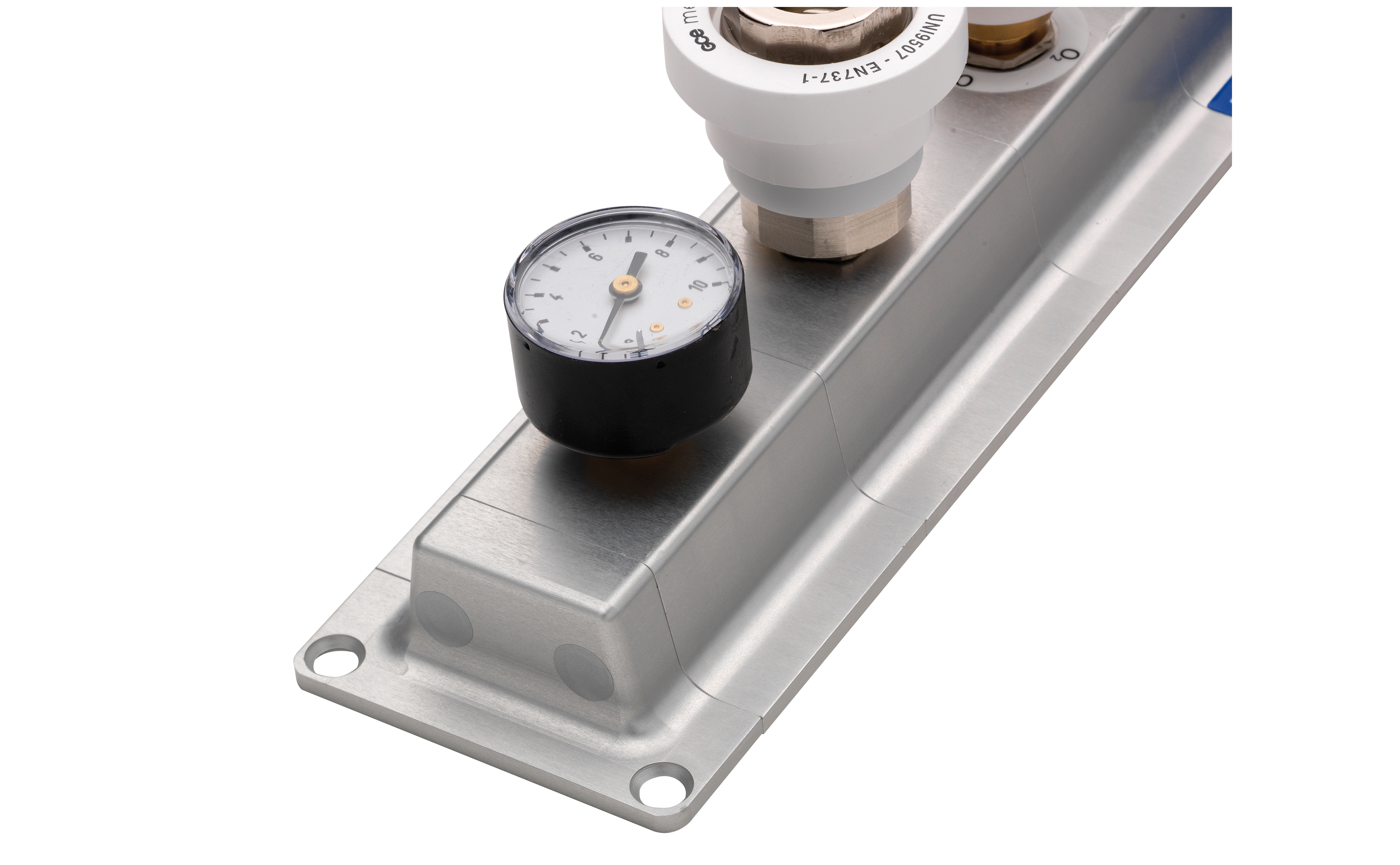 Exposed mounting is when the ambulance panel is mounted on the wall in the ambulance. The inlet could as the recessed, also be located at the end or at the back. When using the end inlet the hoses are fastened on the wall and fully visible. For some countries and regulations this is a must and the Ambulance Panel II has the features complying to these requests. The panel is fastened easily by 4 screws. Depending on the wall construction the fastening could either be done by a counter fastening frame or nuts and washers.